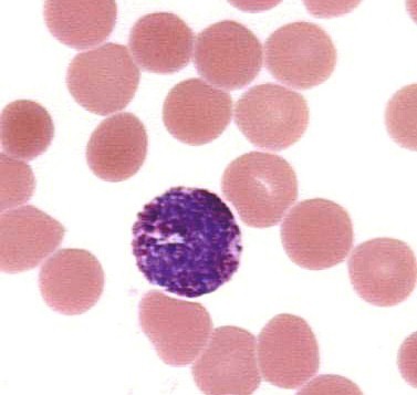 A basophil is characterized by a lobed nucleus and it is filled by large blue-black granules that sometimes cover the nucleus. Here you can see the distinct granules against the purple nucleus. Can you find platelets on this photo?