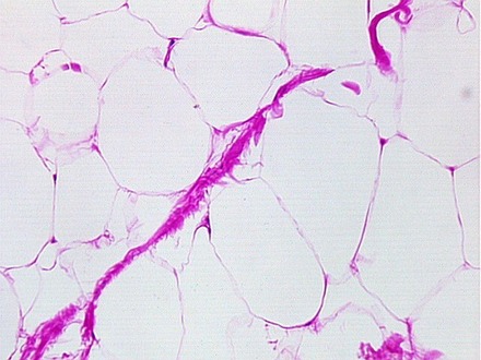 Adipose tissue is found in the hypodermis of the skin, or surrounding many organs muscles, nerves, etc. You can see it at the base of the section in slide 25. It is made of relatively large cells that are distinguished by a thin process surrounding a large droplet of fat. The nucleus is very thin and small. Thus, adipose tissue looks like a "honeycomb" with the cells being the walls of the chambers and the fat droplets filling the center. The processing of this section has removed the fat droplet and the cell center looks clear. If you want to see fixed, stained fat droplets, look at slide 8 and find the adipose tissue around the peripheral nerve.