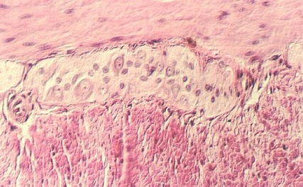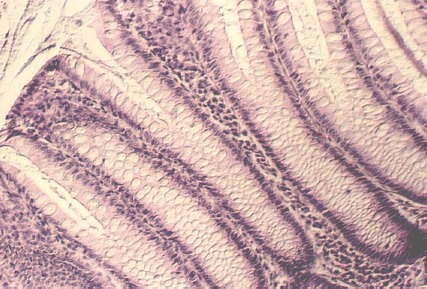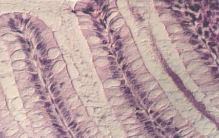 The above photograph shows a higher magnification of the colon epithelium with its numerous Goblet cells. Compare this view with that showing the SURFACE MUCOUS CELLS of the stomach.