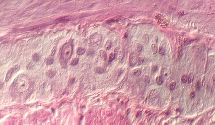 Look at slide 55, the Ileum. The MUCOSA extends into the lumen again in the form of long villi. Note that there are more GOBLET cells in the Ileum than in the Duodenum. You can also see clusters of LYMPHOID TISSUE, called PEYER's PATCHES. You might be able to find enteroendocrine cells, but the Paneth cells are not obvious. Also, find the SUBMUCOSA, MUSCULARIS EXTERNA and Auerbach's plexus.