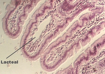 The intestine is specialized for absorption and further digestion, as well as water conservation. The mucosal epithelium continues to be simple columnar. However, base of the gland is called the "crypt" and there are no pits. Look at slide 53, which is the duodenum. Find the epithelium which is lining long projections called VILLI. The core of the villus contains the LAMINA PROPRIA and strands of smooth muscle, which is part of the MUSCULARIS MUCOSA. The following photo shows duodenal villi. Note the LACTEAL in the lamina propria. What type of vessel is the lacteal?