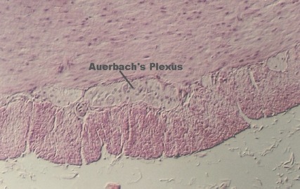 Identify the MUSCULARIS EXTERNA in slide 53. This consists of inner circular and outer longitudinal layers. Auerbach's plexus lies between the muscle layers, as shown in the following photographs.