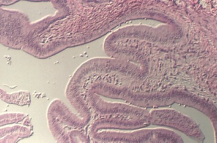 The epithelium of the Appendix contains numerous Goblet cells, but they are not as numerous ad in the colon or rectum. There are no Villi or Plicae. The lamina propria and submucosa is filled with diffuse lymphoid tissue. Note that, unlike Peyer's patches in the ileum, the follicles in the appendix completely surround the lumen. Also, unlike the ileum, there is debris in the lumen.