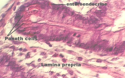 in the following photo. Recall that the red granules of the enteroendocrine cells are