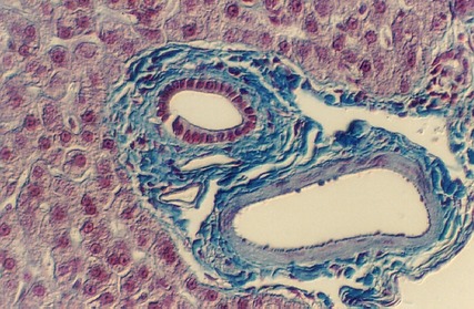 The above slide of liver was stained with a van Giesson Stain. The connective tissue is stained red, the cytoplasm yellow, and the cell nuclei brown. BILE DUCTS can be seen. HEPATIC Arteries can also be distinguished by the yellow brown smooth muscle in the arterial walls. You can also find CENTRAL VEINS.