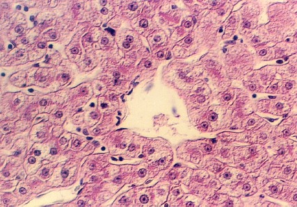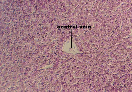 The hepatic parenchymal cells may be binucleate (can you find one in the above photo?). On either side of the rows of liver cells, are the sinusoids. Venous blood that will leave the liver flows towards the central vein (center of the Hepatic lobule.) Another view of the Central vein, from slide 60, is shown in the following photograph. You can see the connective tissue wall of the vein better because the trichrome stain is bright blue.