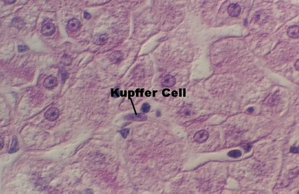 Stretching across the SINUSOIDS are phagocytic cells called KUPFFER CELLS which are distinguished by their processes. The following photographs show Kupffer cells.