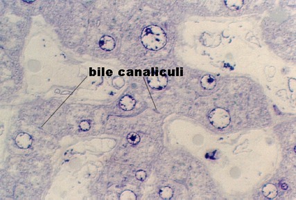 Bile flows from the liver cells out through small channels between the cells called BILE CANALICULI to the BILE DUCTS located along the sides of the Hepatic lobule. These can be seen in thin plastic embedded sections of the liver in slide 2. They appear as a small round gap between adjacent hepatocytes. The SPACE of DISSE can also be seen, however it is artifactually enlarged.