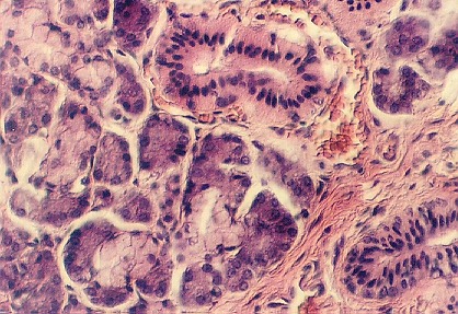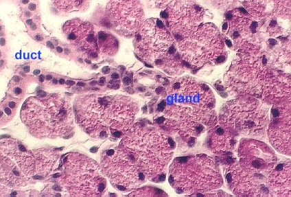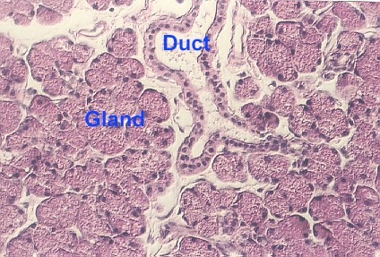 Above, the photograph shows the Parotid gland, which is a large salivary gland that consists of cells that are largely serous. It is divided into lobes by connective tissue septa. Clusters of gland cells are organized in Secretory acini. The cells are filled with granules. The saliva is collected in small ducts that leave the lobules and move out into the connective tissue between the lobes. Identify gland and duct cells in these photographs.