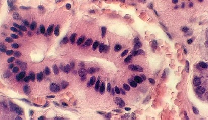 This view shows one of the ducts in the sublingual gland called the Striated duct. The nuclei have been pushed towards the lumen.