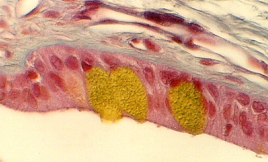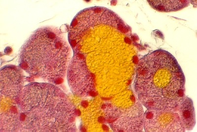 This shows a section of the submandibular gland stained with Masson's trichrome and Alcian yellow. The yellow stain detects the mucous cells. They are easy to distinguish.