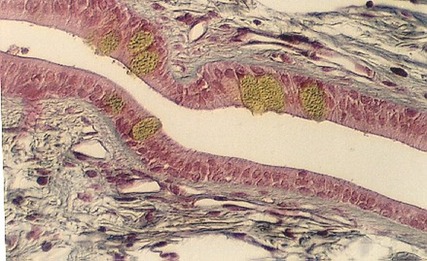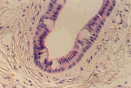 In the interlobar connective tissue, large EXCRETORY DUCTS can be seen. These are distinguished by their layers of nuclei and Goblet cells. The following photographs show views of this type of duct. Identify the Goblet cells.