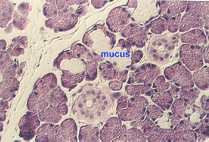 The sublingual gland, seen below, has more mucous cells than serous cells. The above photograph shows a section of the sublingual gland. You can also see serous demilunes in this gland.