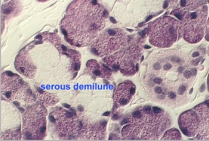 In some of the acini, the serous cells form a cap (shaped like a half moon) over the centrally located mucous cells. This is called a SEROUS DEMILUNE. These photographs show the granules in the serous glandular cells as well as the mucous cells in the center of the demilune.