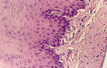 layers of cells are stained dense purple. The apical layers face the esophagus lumen and