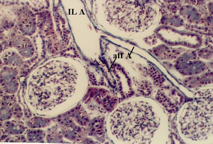 Move up into the cortex of your kidney slides and find medullary rays. Then find large arteries that run parallel to the rays. These are called the INTERLOBULAR ARTERIES . If you are lucky, you can also see some Interlobular arteries (IL A in following photo) that are branching and penetrating the lobules. These are the AFFERENT ARTERIOLEs and you may be able to follow them all the way to the glomerulus as is shown in the following photograph. Then, the afferent arterioles break up into the glomerular capillaries. These converge and form another arteriole that leaves the glomerulus called the EFFERENT ARTERIOLE.