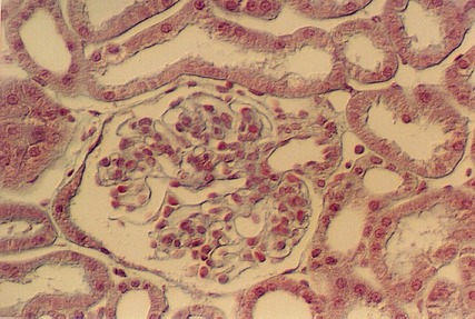 The outer regions, called the cortex are distinguished by numerous sectioned profiles of tubules and glomeruli. Identify the capsule and look at a glomerulus with a higher magnification. It is essentially a tuft of capillaries embedded in a double-walled epithelium (like a fist in a balloon). The epithelium is called "Bowman's capsule". That part of the epithelium covering the capillaries is called the visceral epithelium. The part forming the capsule is called "parietal epithelium". The filtration membrane is formed from the endothelial cells of the capillaries, basement membrane, and visceral epithelium. What cell types are found in the visceral epithelium? Draw the epithelial cell that forms the filtration membrane or barrier.