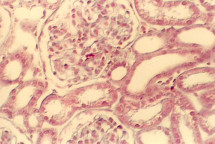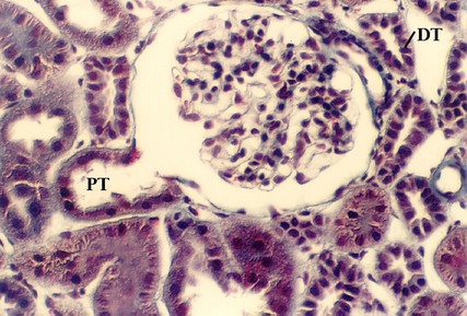 The profiles of the cortex will show proximal and distal tubules. They are supplied by a capillary network, called the Peritubular capillaries. In the above photograph, numerous proximal tubules are seen (PT). The cells are distinguished by an uneven apical border (because it is a brush border). Also, the base of the cells have many interdigitating processes that are filled with mitochondria. These can be visualized in the Masson stained section, shown above, as "ridges" running through the cells.