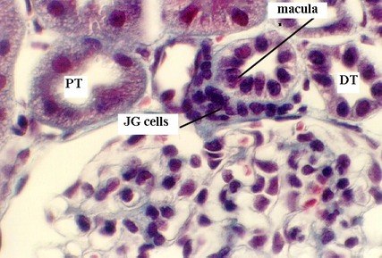 After you have identified the vessels, you can better understand the organization of the endocrine system in the pituitary called the Juxtaglomerular apparatus (JG apparatus). This apparatus is found near each glomerulus where the afferent and efferent arterioles lie next to a distal tubule. The cells of the distal tubule become taller and form a structure known as the MACULA DENSA. Somehow this group of cells are specialized to sense the fluid volume and pass this information on to some specialized SMOOTH MUSCLE CELLS in the Afferent and Efferent Arterioles. These are called JUXTAGLOMERULAR CELLS. They have differentiated into endocrine cells and they produce a hormone (which is really an enzyme) called RENIN. Renin is produced on rough endoplasmic reticulum and packaged in large granules. Together, the Macula Densa and the JG cells are called the JG apparatus. Several views are seen in the photographs below.