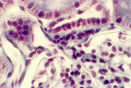 In contrast, Distal tubules have no brush border (DT). They have lateral interdigitations, however. They are distinguished from proximal tubules by the fact that they have a smoother apical surface. Also, the cells are smaller. Therefore, it is likely that one will see a nucleus in every profile. In contrast, proximal tubule cell profiles may not show as many nuclei. Find a peritubular capillary in the above photograph by the presence of stacked red blood cells.