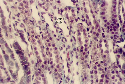 The proximal tubule then changes to squamous epithelium which passes down to the medulla and then loops back up to the cortex. There are "highways" of tubules called "MEDULLARY RAYS" that contain tubules passing to the medulla. The thin part of the nephron is called the "LOOP of HENLE". As it ascends to the cortex again, it thickens to form the "THICK ASCENDING LIMB" of the Loop of Henle. Then, it becomes cuboidal and forms the DISTAL CONVOLUTED TUBULE. This part of the nephron joins with the COLLECTING TUBULES which then descend to the medulla in the medullary rays.