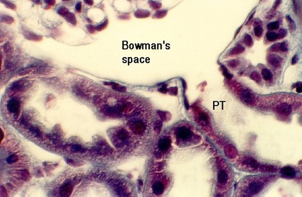 The above photograph shows a higher magnification of the Urinary pole. It shows the transition between Bowman's Space in the Renal Corpuscle and the Proximal Convoluted tubule. Note that the cells show an abrupt transition from simple squamous to simple cuboidal in the proximal tubule (PT). Note also that the connective tissue elements supporting the tubules are stained bright blue in this Masson stained section.