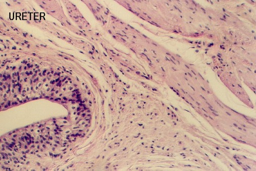 After they begin in the calyces, the two muscular tubes, the URETERS, conduct the urine to the bladder. The following photograph shows the transitional epithelium in the ureter. Find it in your ureter slide. Recall that it is distinguished by rounded cells at the surface. It is a mixture of columnar and cuboidal epithelia which is how it got its name.