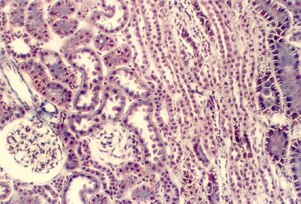 Move into the medulla and find the tubules there. You should be able to distinguish the VASA RECTA by their content of blood cells. Also, the thin limbs and the thicker limbs of the LOOP of HENLE can be seen. Finally, the COLLECTING TUBULES are cuboidal and columnar. They grow taller as they descend in the medulla. Identify the three types of tubules in the above photograph by the size and shape of their epithelium and the presence or absence of blood cells. What is the function of the thin limb of the Loop of Henle? What is the function of the Vasa recta? What is the function of the Collecting ducts?