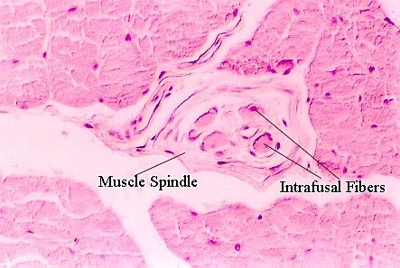 This cross section of skeletal muscle includes a profile of a muscle spindle. It is distinguished by layers of connective tissue surrounding centrally located nerves and muscle fibers, called "intrafusal fibers". What is the function of a muscle spindle and what is the significance of the close association between the intrafusal fibers and the nerves?