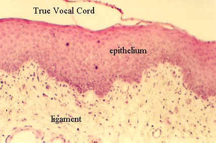 Look at slide 44 This is a frontal section through one-half of the larynx. Follow the epithelial lining and note that it changes from Respiratory epithelium (pseudostratified columnar) to stratified squamous non-keratinixed epithelium.
