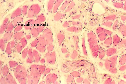 The stratified squamous epithelium signals that you are in the True Vocal Cord. The photograph to the left illustrates the epithelium. Move deeper under this epithelium. You will first encounter dense connective tissue. This is the Vocal Ligament. Continue to follow this tissue to a mass of muscle cut in cross section. This is the Vocalis muscle. It is illustrated in the photograph, below.