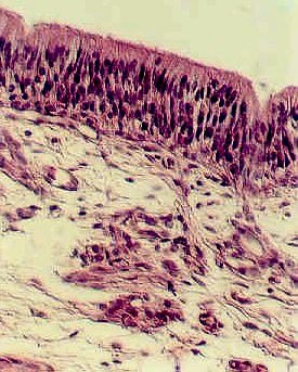 The nuclei nearest the lumen belong to the Sustentacular cells. They are elongated. The middle layer of nuclei are rounder and somewhat paler. These belong to the Olfactory cells. The nuclei of the Basal cells are the third layer, nearest the connective tissue. They may be difficult to identify. Study an electron micrograph of Olfactory cells and learn how they are specialized for olfactory sensation. Also, learn the function of each of these three cell types.