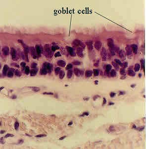 The connective tissue under the epithelium is called the "adventitia". In this connective tissue are numerous seromucous (mixed) glands, as well as blood vessels and nerves. These are called "tracheal glands". Identify the serous and mucous cells in the glands on your section and also on this photograph (to the left). Serous glands contain proteinaceous granules and are therefore stained light purple. The mucin in the mucous glands is washed out. The mucous glands are therefore the lightest staining. What is the function of these glands?