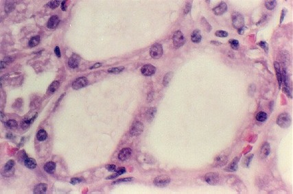 The following photograph shows views of non-lactating mammary gland cells. Find slides 80 and 81 in your slide set. In the non-lactating mammary gland, there is a lot of connective tissue around the glandular cells (intralobular connective tissues) and also a lot of connective tissue inbetween the lobules (interlobular connective tissue). In these photographs, use your sweat gland photos as a guide. Identify the mammary gland cells and the myoepithelial cells