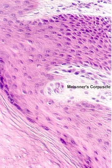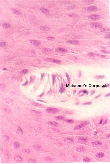Touch receptors are found in the dermal papillae as Meissner's corpuscles. The following views show high and low magnifications of Meissner's corpuscle in the dermis of thick skin. This is a touch receptor.