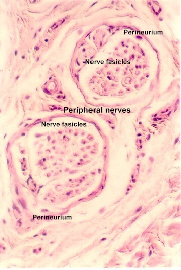 In the dermis and hypodermis, large bundles of peripheral nerves are seen. They are distinguished by a connective tissue sheath (perineurium) and nerve fasicles (bundles) that include the axons, oligodendroglia, and endoneurium.
