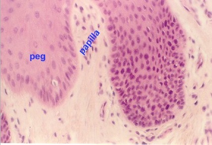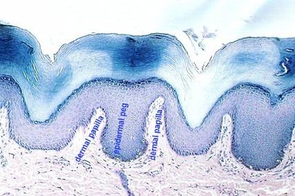 Thick skin, showing the epidermis and a part of the dermis. Identify the following structures: Papillary dermis, dermal papilla, epidermal pegs. Higher magnifications of these regions from your class slide set are seen in the following figure.