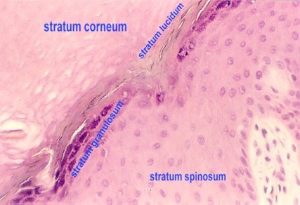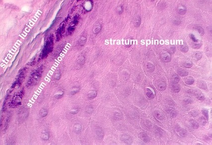 The above view shows the stratum spinosum, stratum granulosum, and stratum lucidum of the skin (Identify the regions). Higher magnifications are shown in the following photographs.
