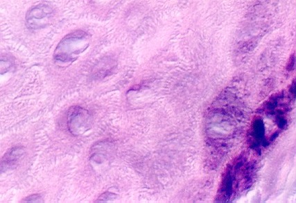 The stratum spinosum and granulosa are shown at higher magnification with Nomarski optics in the photo above and below this legend. The spiny appearance of the spinosum cells is caused by desmosomal attachments. The cells have shrunken away from one another and each spine represents an area where the cells are connected. Review your studies of desmosomes in the Epithelia unit.
