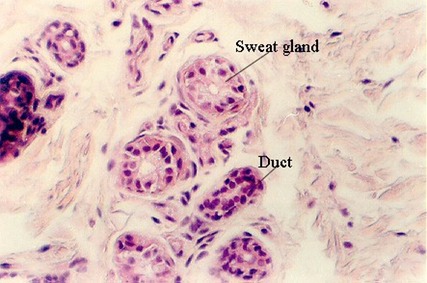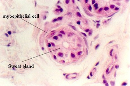In your slide of thick skin (slide 25) identify secretory and duct portions of eccrine sweat glands. The following photographs show both portions. You should find a myoepithelial cell and classify the type of epithelium in the duct.
